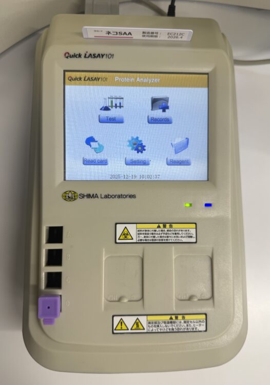SAA(血清アミロイドA)、α1-AGP(α1酸性糖タンパク)、Dダイマーという項目もこちらの装置で測定します。SAAはCRPよりもさらに早く反応することが多く、特に猫ではCRPよりSAAの方が炎症の指標として有用とされています。