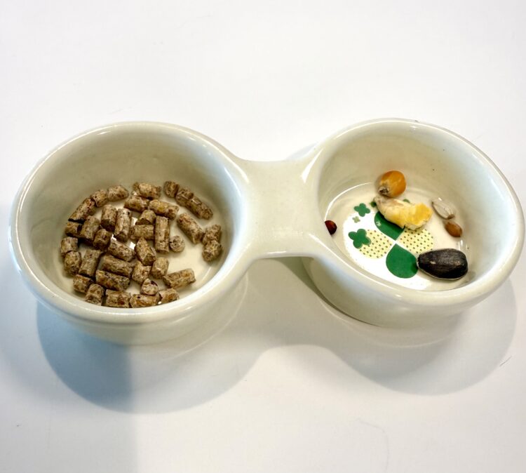 食餌はハムスター用ペレットを1日1〜2回、決まった時間に決まった量を与えましょう。量は体重の5〜10%が目安です。