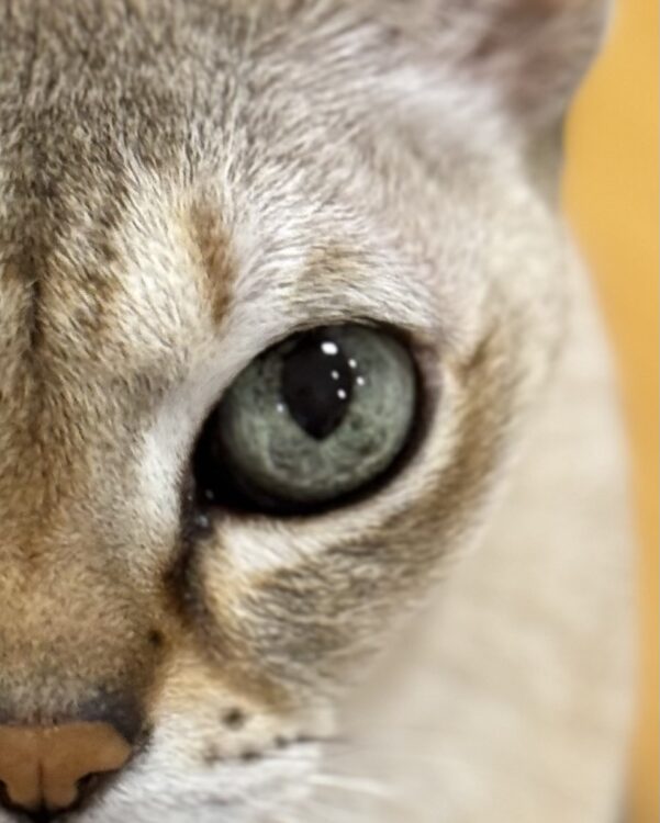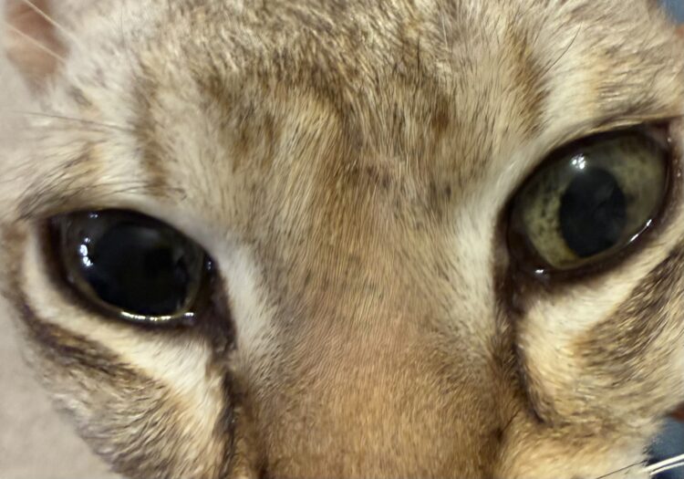 – 虹彩(瞳孔の周りの色付き部分)が薄くなったり穴が開いたように見えたり → 虹彩萎縮(特に老齢の子に多い)ですが、他の病気のサインのことも。また、虹彩にシミが増えたと感じる場合、腫瘍のこともあるので動物病院の受診をお勧めします。