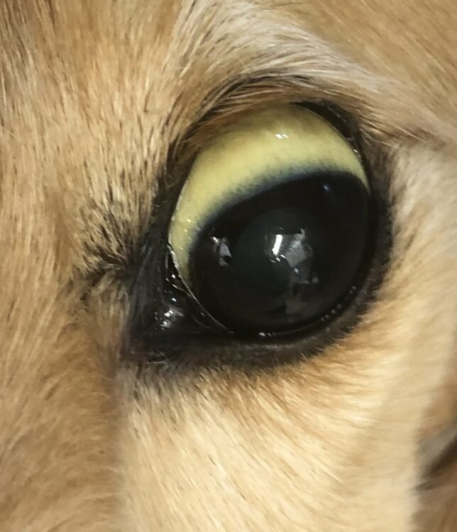 目の病気というわけではありませんが、肝臓や胆道、溶血性の病気などが隠れているサイン。目だけではなく、耳の内側や歯茎も黄色くなっていないか確認してみてください。全身疾患のことが多いので、眼科だけでなく内科的な検査も必要になります。